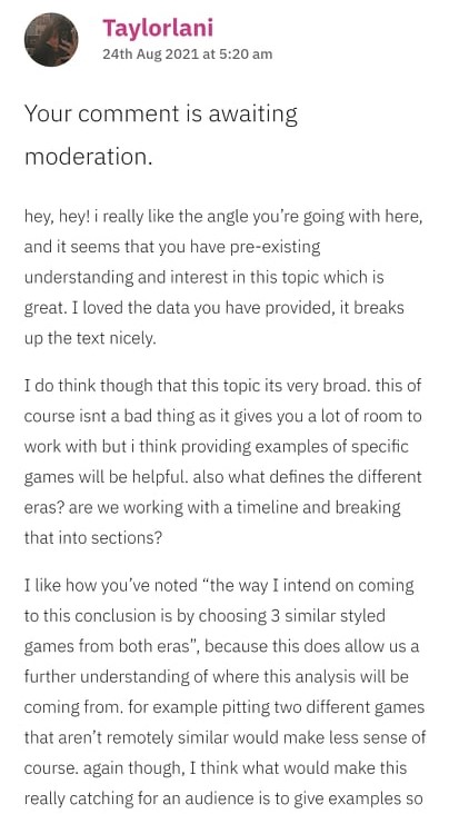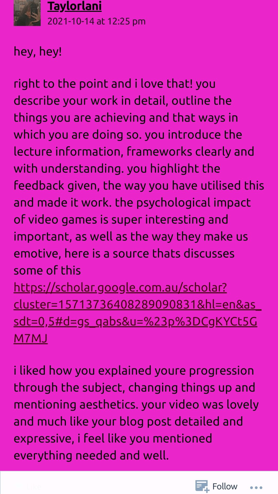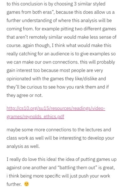 I then moved onto reading and engaging with Jules’ pitch, which really struck me because of the similar concepts but different ideas involved. I love seeing how differently people can execute projects. Their DA dives into the concept of nostalgia and its correspondence in gaming. Not only that, but they included the science side of things, going deep into what they wished to achieve with this project.