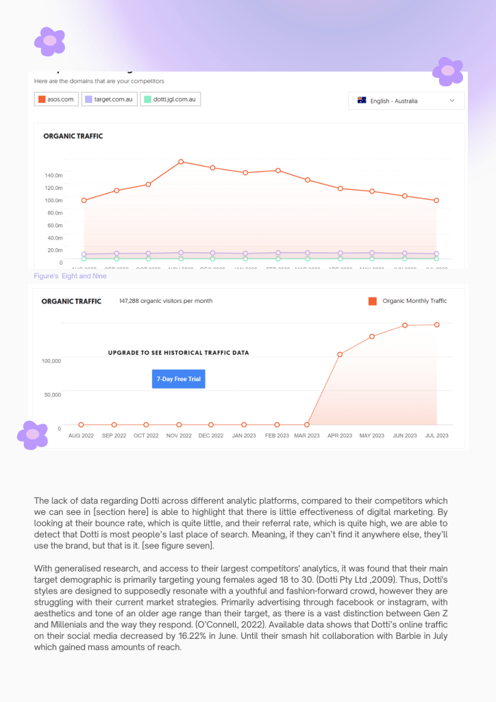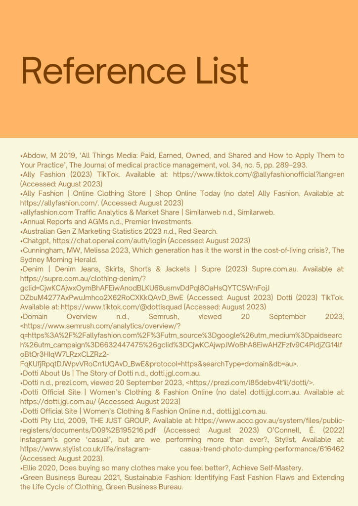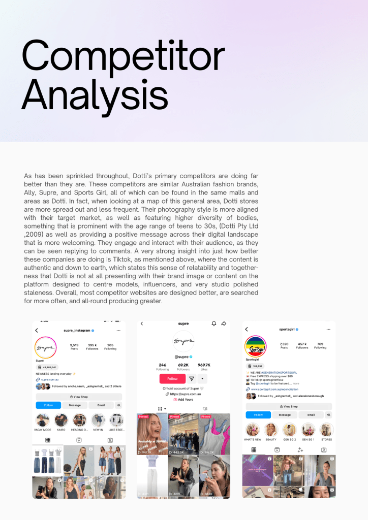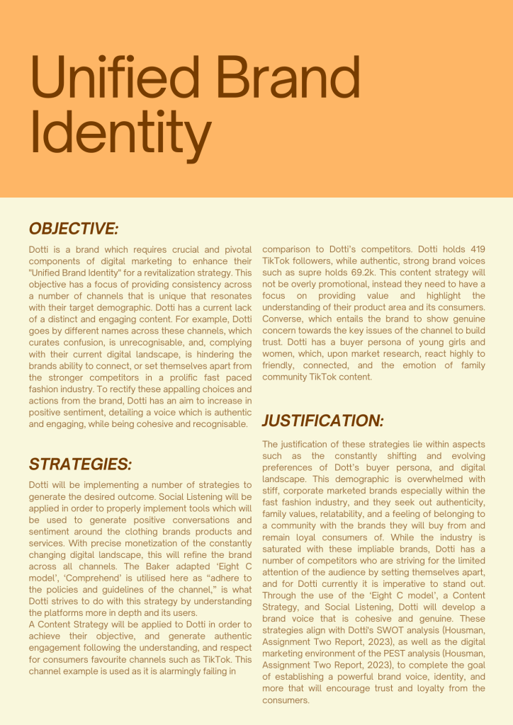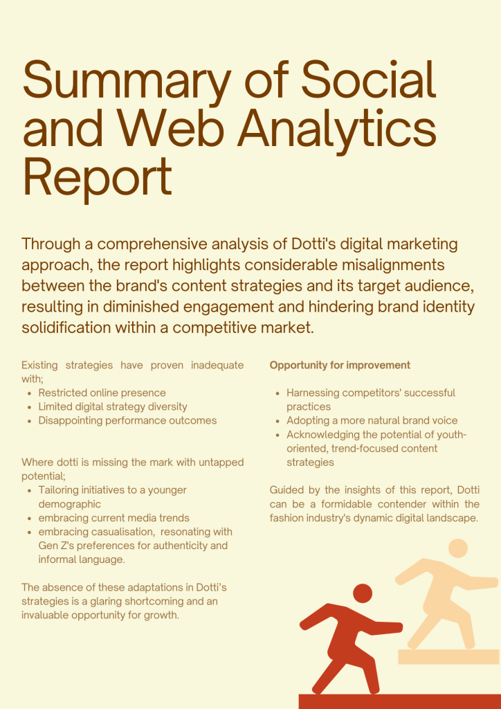 This report presents an extremely detailed and comprehensive analysis of the digital marketing landscape within the Australian fast fashion industry in regards to the clothing brand Dotti. The research is underpinned by an array of methodologies, including SWOT and PEST, Social Intelligence Data, Social and Web Analytics Data, Social Media Auditing Data, Competitor Analysis, and Recommendations derived from the findings. The study aims to highlight Dotti’s current challenges, strategic deficiencies, and potential avenues for revitalization in the dynamic digital marketing arena. The report outlines key findings and provides actionable recommendations for optimising digital marketing strategy, improving engagement and customer satisfaction, and differentiating from competitors.