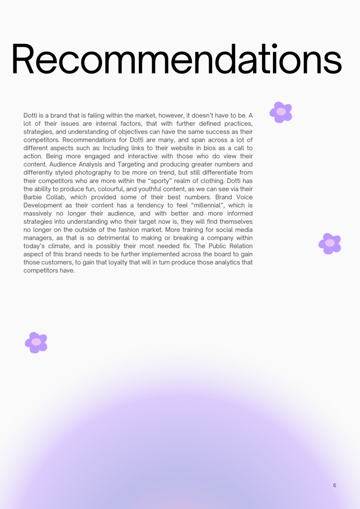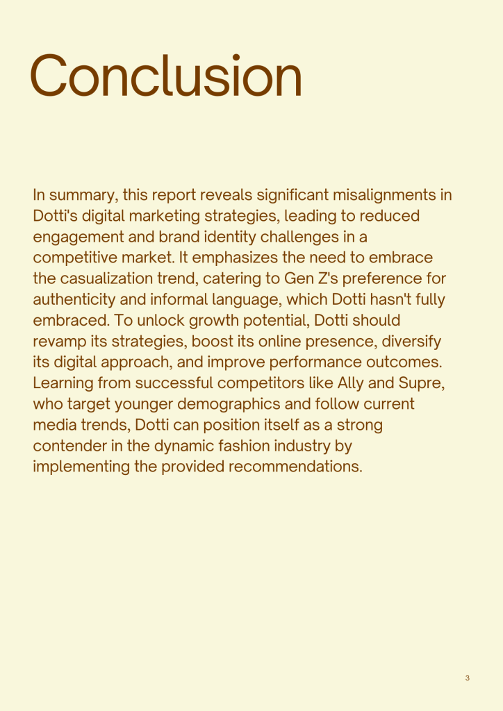 The analysis points out Dotti’s limited online presence, a lack of diversity in its digital strategies, and underwhelming performance outcomes, indicating the inadequacy of previous marketing approaches. In contrast to these shortcomings, this report highlights the emergence of casualization as a highly effective communication method. This approach resonates with Generation Z’s preference for authenticity and informal language, elements that are notably absent from Dotti’s current strategies.